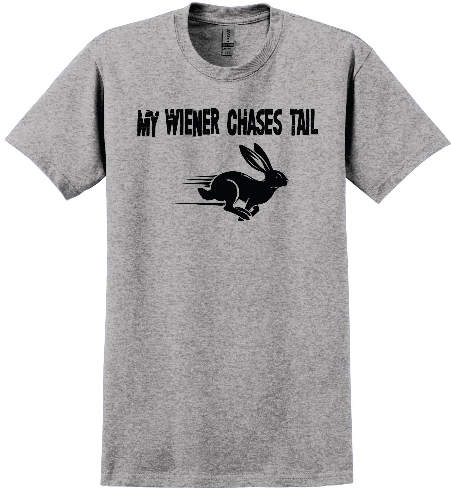 Design: “My Wiener Chases Tail” with a sleek, high-speed hare graphic