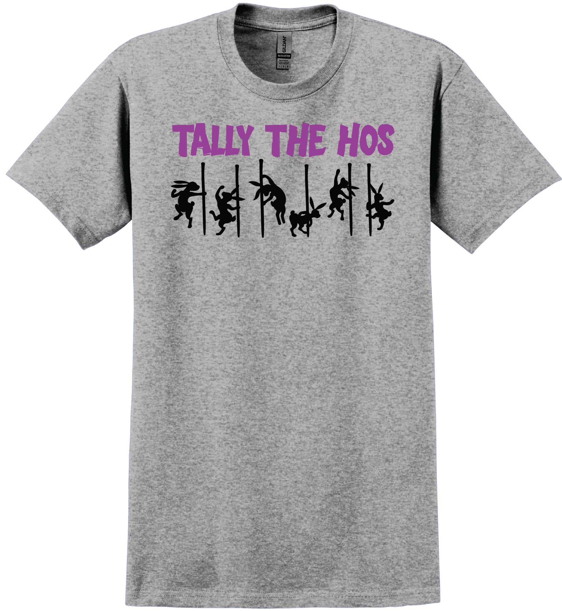 Bring the laughs with this cheeky “Tally the Hos” design featuring pole-dancing bunnies and bold purple lettering. Printed on Gildan® Ultra Cotton unisex shirt.