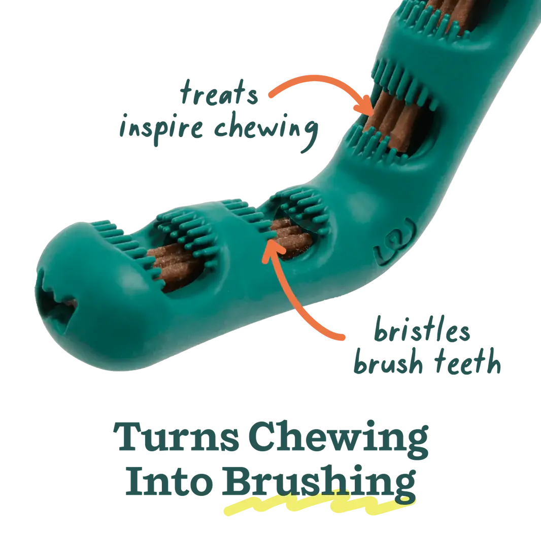 Pair with the Bite n’ Brush to extend the length of the treat, allowing the active ingredients even more time to work. The v-shaped design cleans all sides of the teeth and mouth, letting your dog scrub plaque and tartar off themselves!